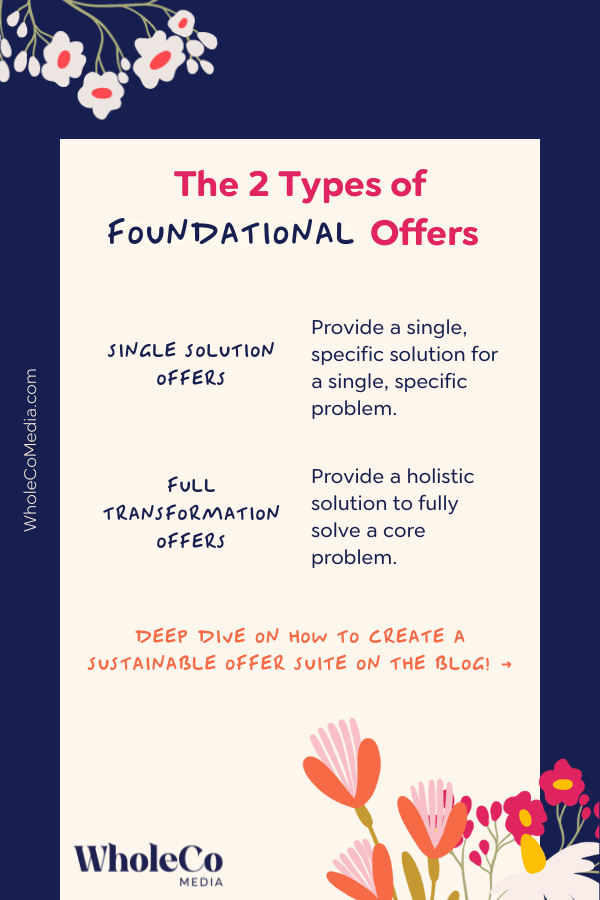 Now that you understand the two types of offers, you can choose which one to build first. Eventually, it will likely benefit you to have both types of offers in your offer suite, though depending on where you’re at in your business, that isn’t something you necessarily need to do right now. Any offer that you build for your business needs to have five foundations in order to make it irresistible for your clients, effective at delivering results, and sustainable for you to sell and deliver. Learn what these five foundations are and how to build them here.