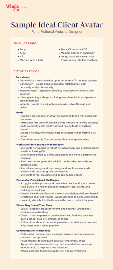 But also: what are you going to do with these core values for your ideal client persona? Create content about “you want a website that shows your authenticity”? Great, now you sound like every other website designer.